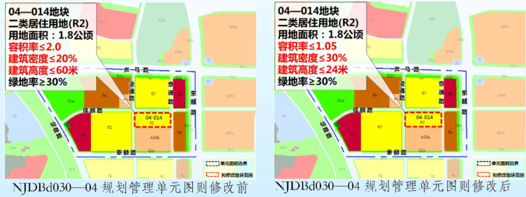 修改内容:将 04-014 地块二类居住用地(R2),容积率由≤2.0,调整为≤1.05、建筑密度由≤20%调整为≤30%、建筑高度由≤60 米调整为≤24 米,绿地率不作调整。