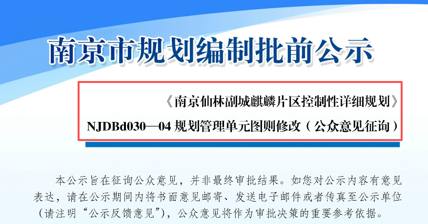 近日,南京官方网站公布了《仙林副城麒麟片区控制性详细规划》NJDBd030-04规划管理单元图则修改(公众意见征询),拟对汇通路3号地块(原中南君启地块)进行规划调整,主要涉及将其二类居住用地容积率从原来的2.0降至1.05,并将建筑限高调整为24米。